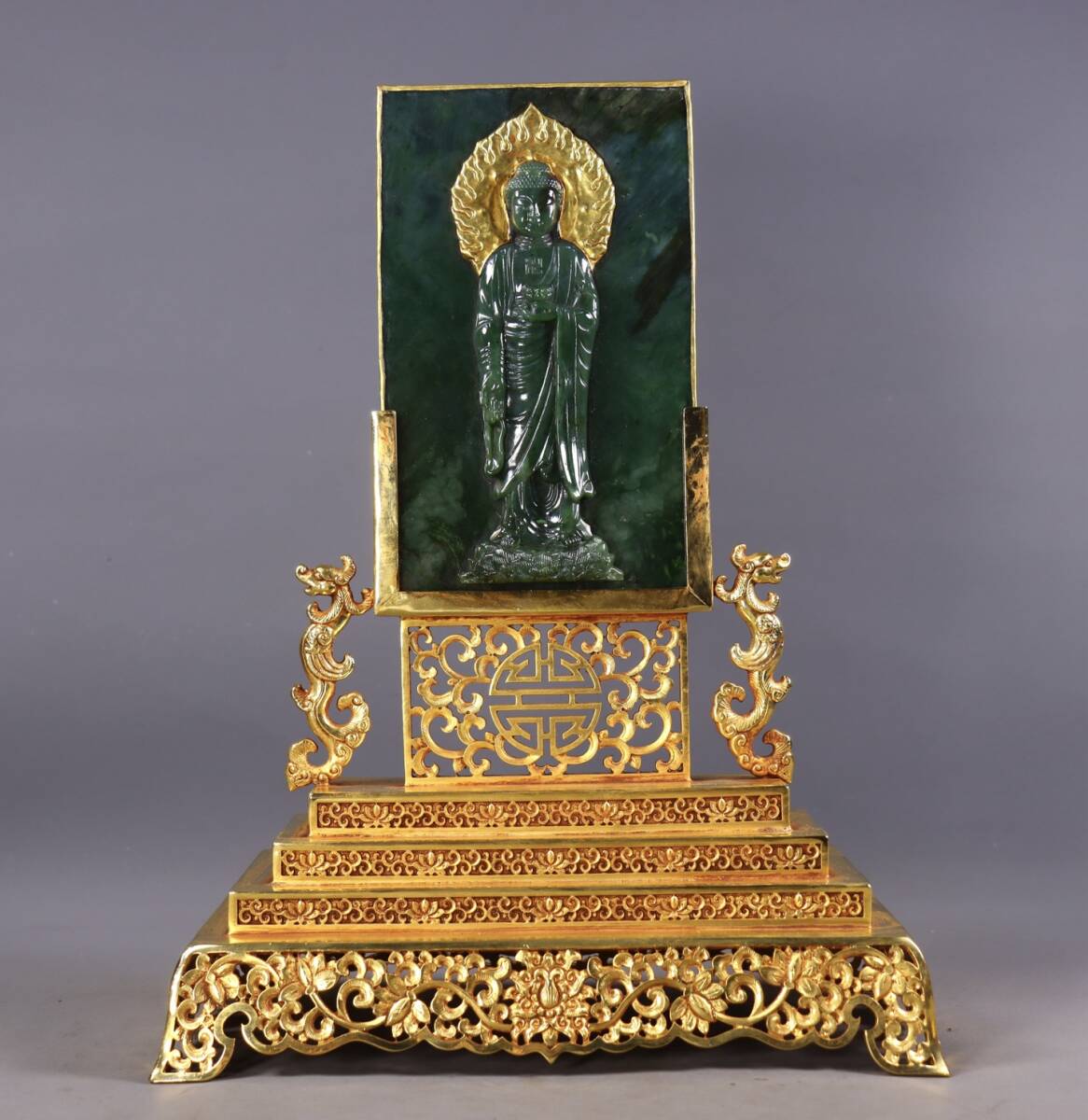 - ◆珍蔵◆中国古美術 大清乾隆年製款 古銅製 塗金 嵌和田玉 碧玉彫り蓮花観音插屏 細密細工造 置物 擺件 古賞物 骨董 時代物 A13