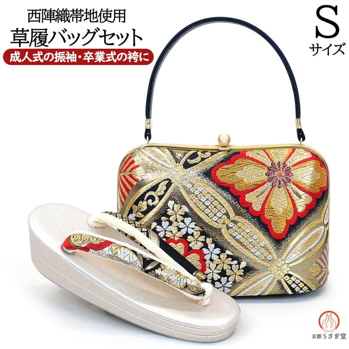 - Sサイズ 草履バッグセット zb-034 日本製 西陣織 帯地使用 黒 金 成人式 振袖
