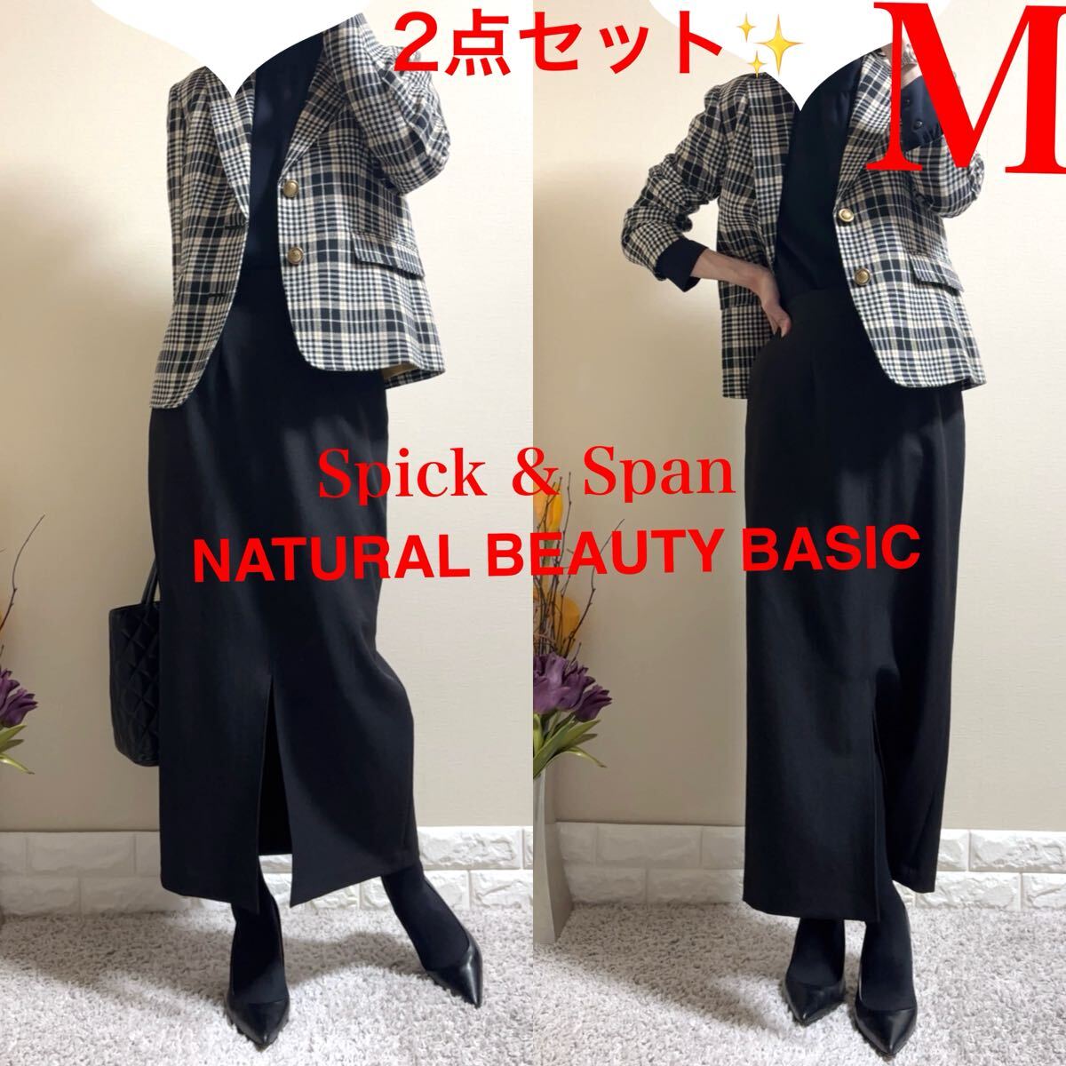 - 美品!Mスーツ!スピックアンドスパン 金ボタン チェック ジャケット 2025年製 ナチュラルビューティーベーシック ロングスカート 黒