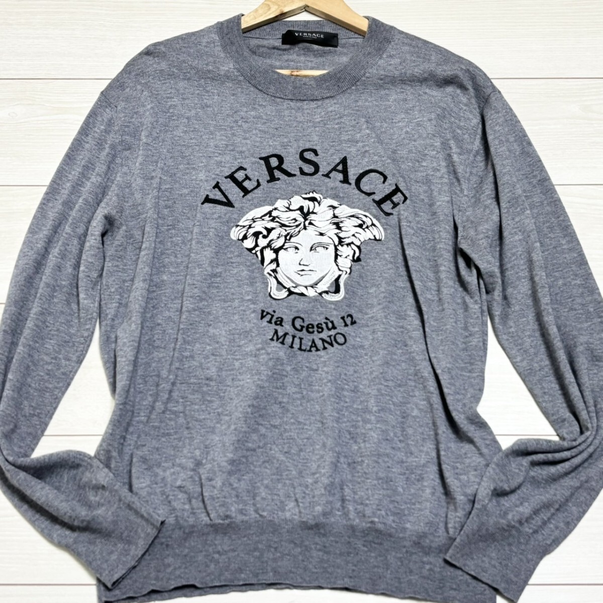 - 極美品/XL(52)サイズ相当●VERSACE ヴェルサーチ メデューサロゴ コットン ウール ニット セーター 長袖 グレー メンズ トップス