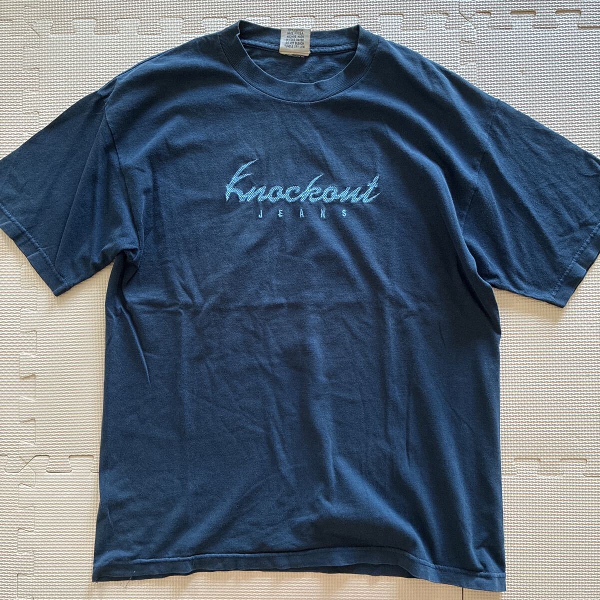 > 90s【Knockout Jeans】ノックアウト ジーンズ USA製 ロゴ刺繍 Tシャツ size L ネイビー 西海岸 チカーノ ストリート系 LA