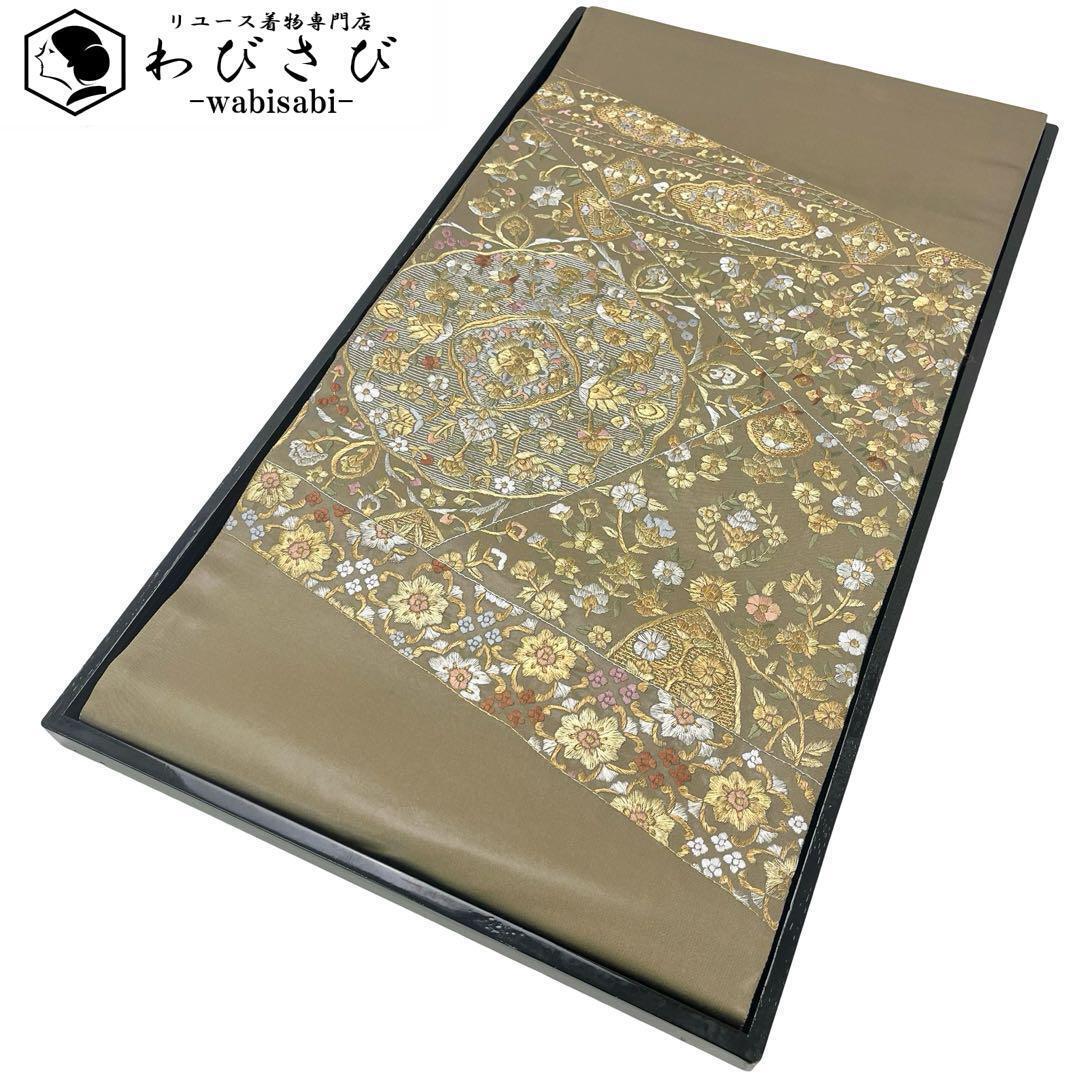 > 袋帯 総刺繍 美しい金銀の煌びやかな花模様 千歳茶色 O-4130 着物 きもの kimono 和服 和装 中古 リサイクル着物 【送料無料】