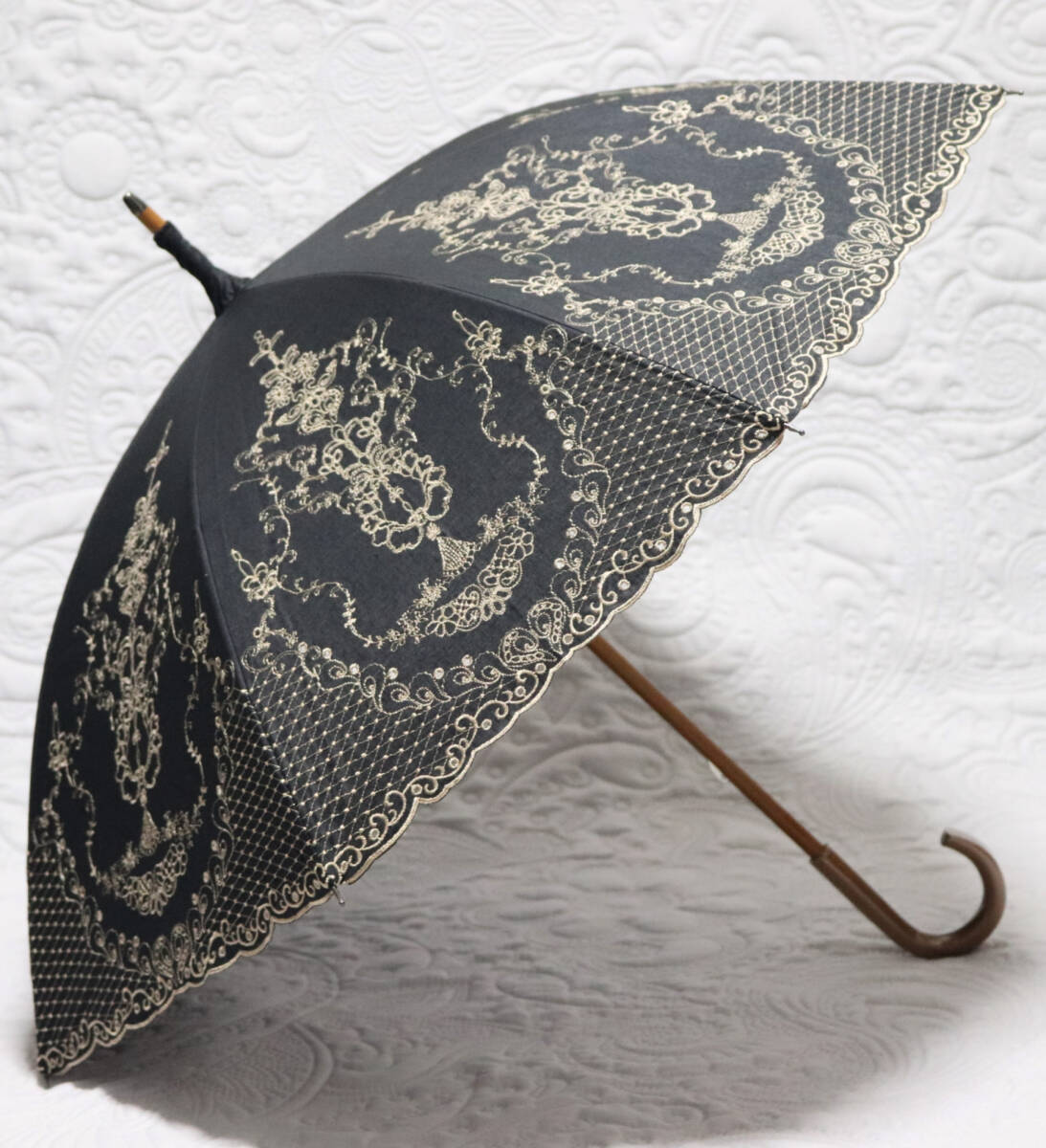 - 新品【晴雨兼用 長傘】繊細 高級感 豪華刺繍 木製 雨傘 日傘 黒 v7276