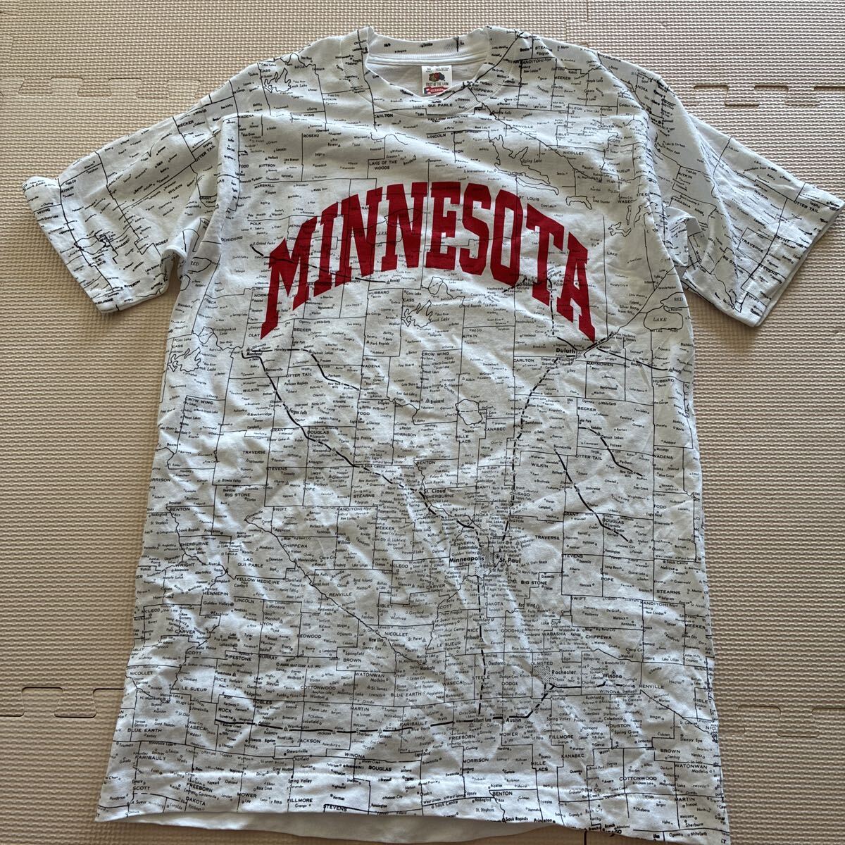 - 90s【Fruit of the Loom】フルーツオブザルーム 総柄 ミネソタマップ Minnesota Map Tシャツ Mサイズ USA製 裾袖シングル