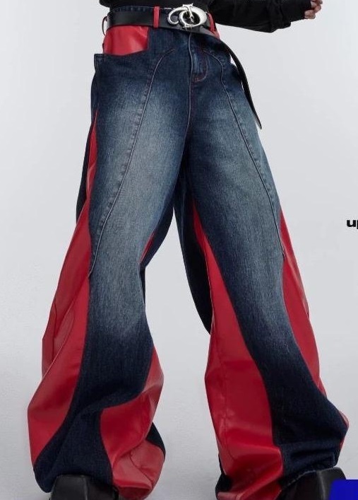 - 新入荷 デニムパンツ ジーンズ オートバイ ワイドパンツ メンズ PU切り替え ハロンパンツ アメカジ 青/L