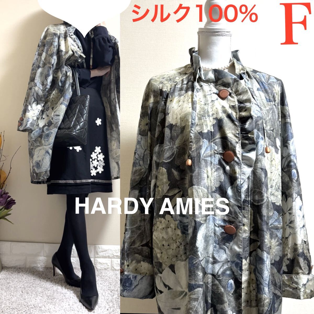 > ハーディエイミス HARDY AMIES シルク100% 英国王室御用達 花柄 ライトコート 春秋コート 大きいサイズ グリーン F イタリアシルク