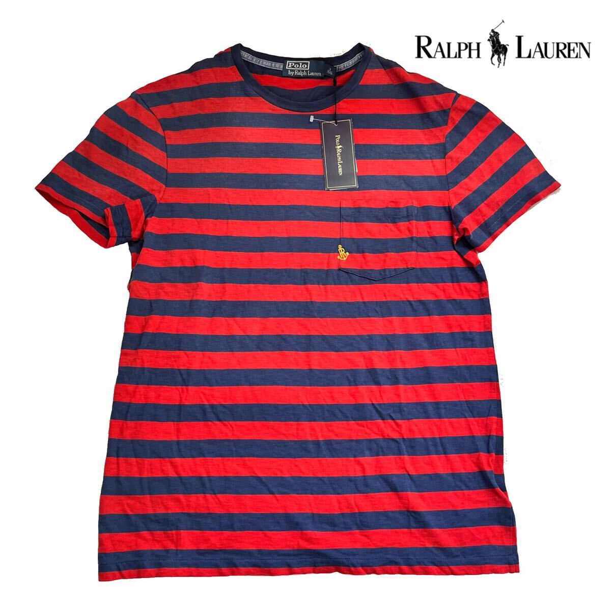 - 未使用 ポロラルフローレン POLO RALFRAULEN Tシャツ 半袖 タグ付き ボーダー柄 夏 レッド ネイビー Mサイズ 175 96 訳あり メンズ