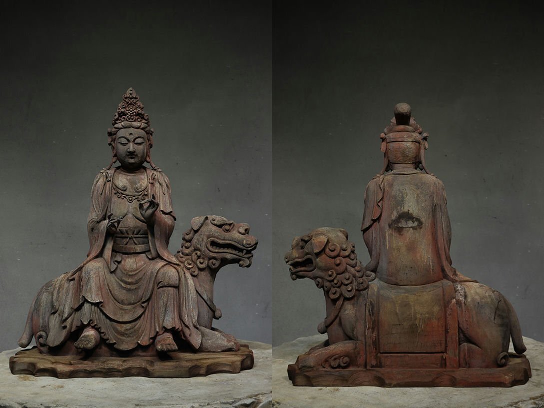 - ▼渡鶴羽▼A9544明時代 楠木 木彫 坐獣観音 楠木細工彫刻★仏教古美術★仏像★細密細工★廃寺旧蔵★廃寺買出品