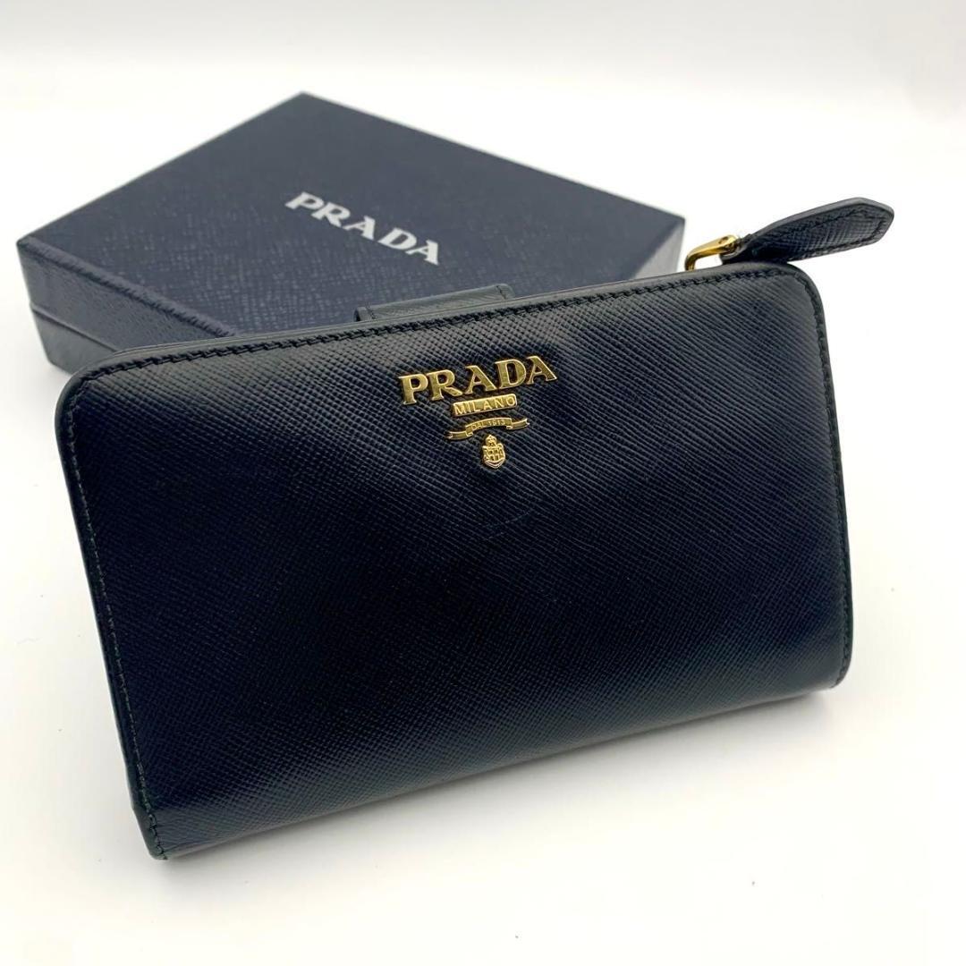 - 美品 プラダ L字ファスナー 財布 二つ折り サフィアーノ レザー 革 ロゴ 黒