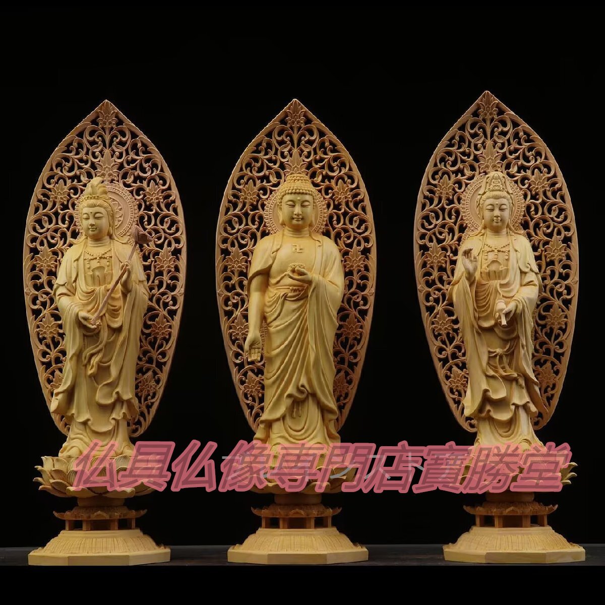 - 【寶勝堂】ツゲ 木彫り 阿弥陀三尊像29cm( 観音菩薩 阿弥陀如来 勢至菩薩 ) 高級木彫り 草光背 蓮台柘植 開運/厄除け 三尊セット