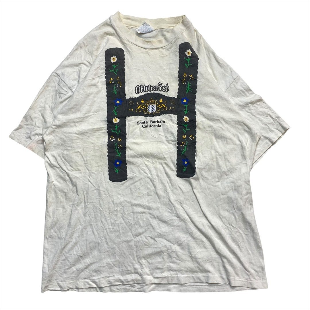 > Vintage 90s HANES Oktoberfest ロゴ レーダーホーゼン風 サスペンダー柄 Tシャツ 半袖 メンズ XL ホワイト 古着 USA製 シングルステッチ