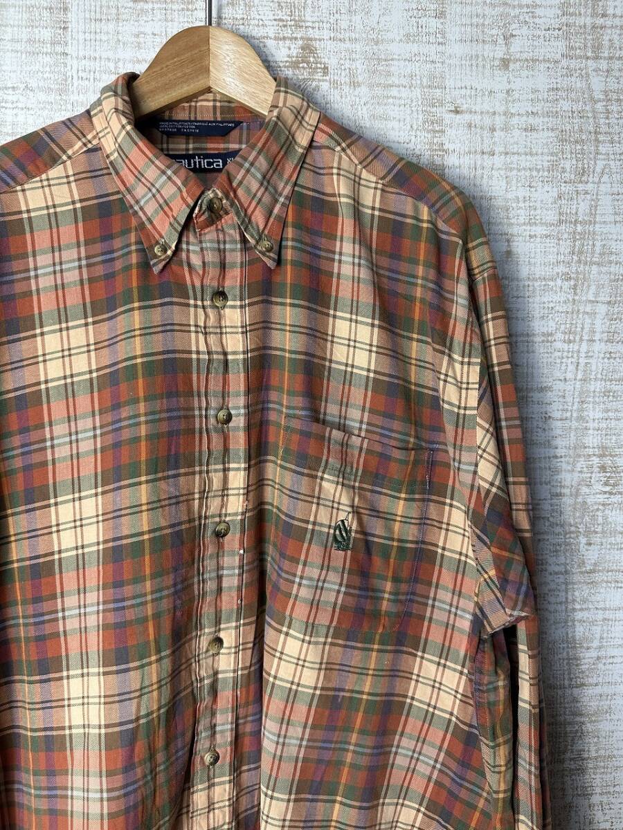 - ☆ビッグサイズ US古着 NAUTICA ノーチカ ネルシャツ チェック柄 薄手生地 長袖シャツ ブラウン茶薄茶カーキ【XL】コットン ◆5157◆