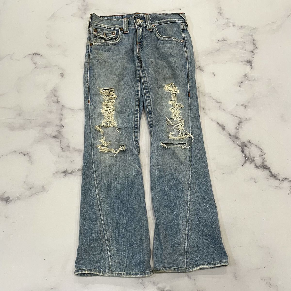 > C ○ 古着ビンテージ!! '米国製' TRUE RELIGION トゥルーレリジョン ダメージ加工 フレア デニムパンツ ジーンズ 27×33 ボトムス ブルー