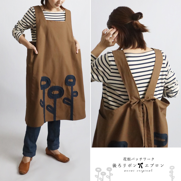 - 芸術の秋SALE 億劫な家事が楽しくなる 花畑エプロン パッチワーク 後ろリボン お洒落 DIY ゆったり キャメル H75A