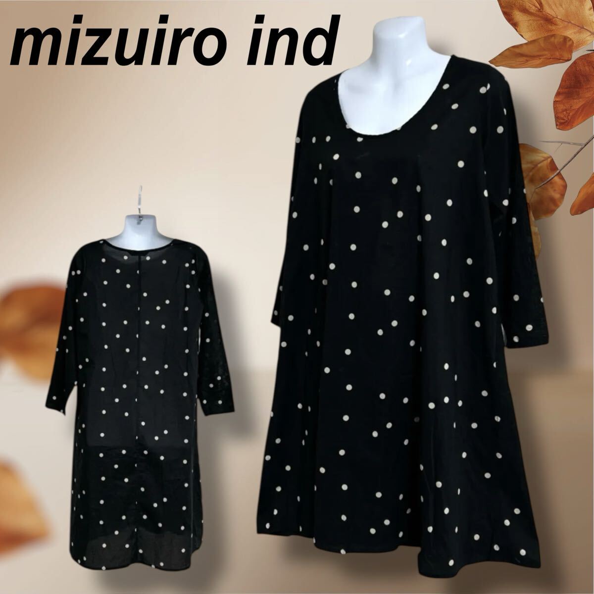 > mizuiro ind ミズイロインド レディース 長袖ワンピース One コットン Aライン 膝下 日本製 ドット柄 ブラック系 (D029)★