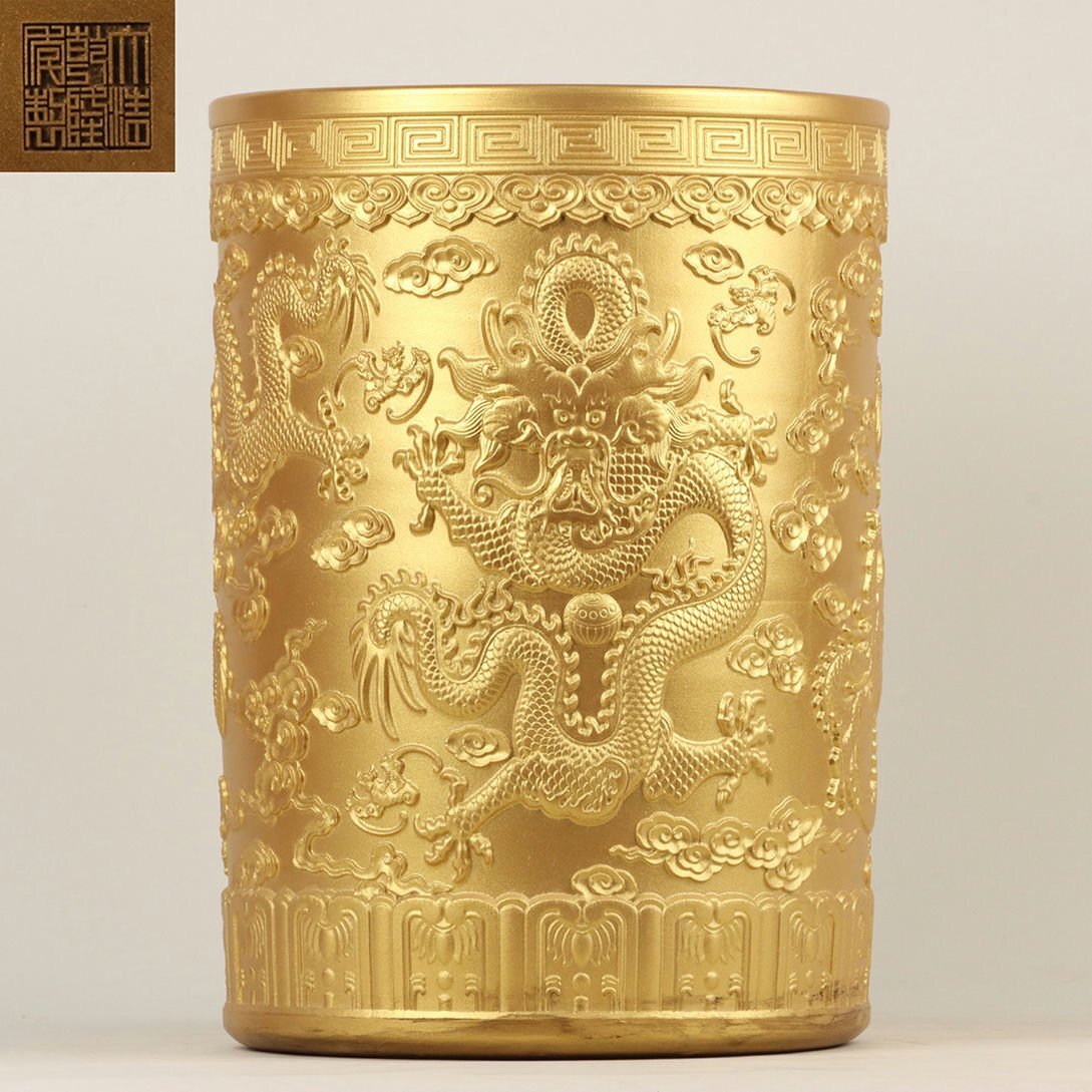 - ▼渡鶴羽▼B1506清乾隆 塗金浮彫九龍紋帽筒・古陶磁器 ・珍品旧蔵・古賞物・時代物