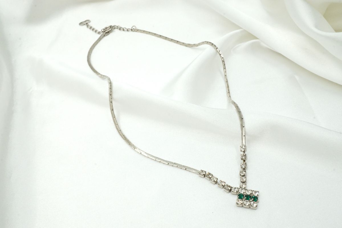 - クリスチャン ディオール ヴィンテージ ネックレス スネークチェーン ラインストーン グリーン 銀 シルバー Christian Dior 3574j