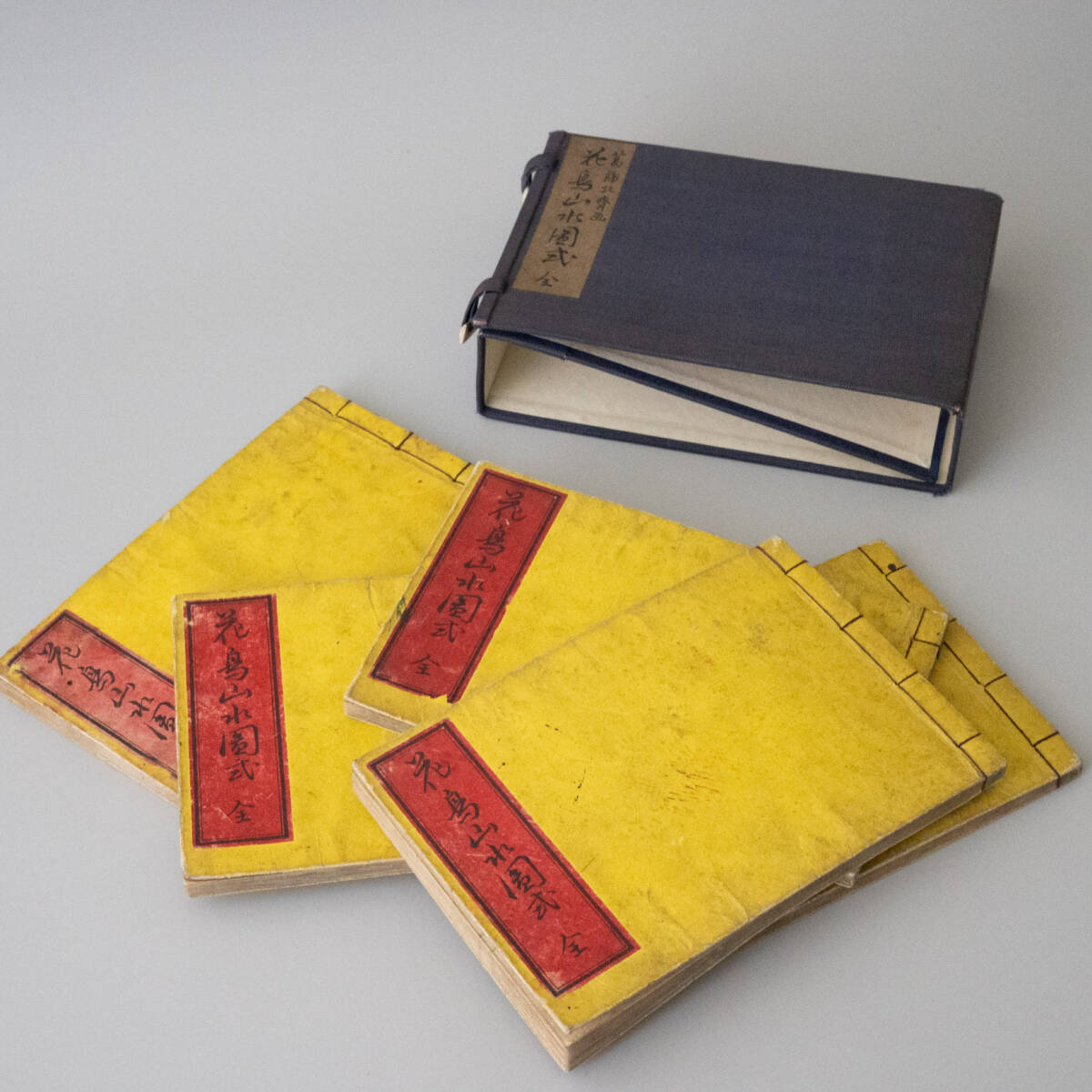 - 花鳥山水図式 全5冊 葛飾北斎画 和本 浮世絵 鍔 小道具 本草 絵手本 刀鍔 動物 植物 葛飾為斎 魚 猫 花 古文書