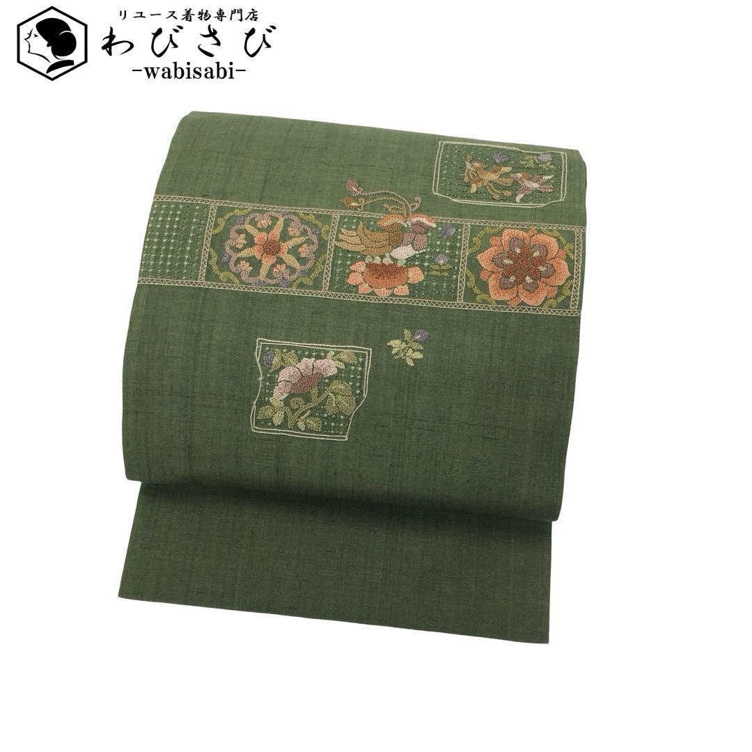 - 名古屋帯 紬 汕頭刺繍 相良刺繍 鳥と花模様 青丹色 O-4278 着物 きもの kimono 和服 和装 中古 リサイクル着物 【送料無料】