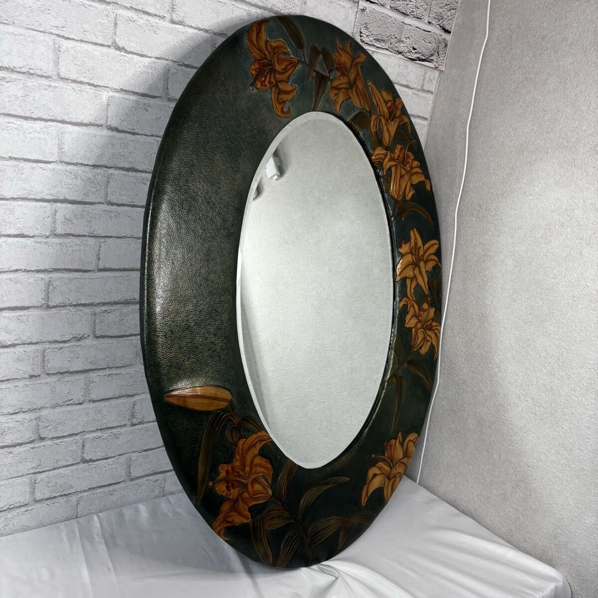 - 大きな楕円形ミラー 鏡 花模様フレーム Satomi J サイン入り 縦88cm×横68cm インテリア ウォールミラー 昭和レトロ アンティーク 百合