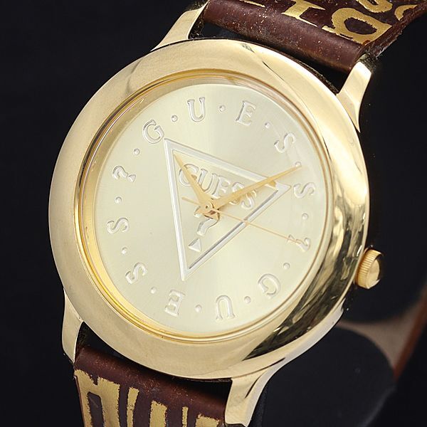 - 稼働 良品 ゲス QZ ゴールド文字盤 ラウンド メンズ腕時計 NKG