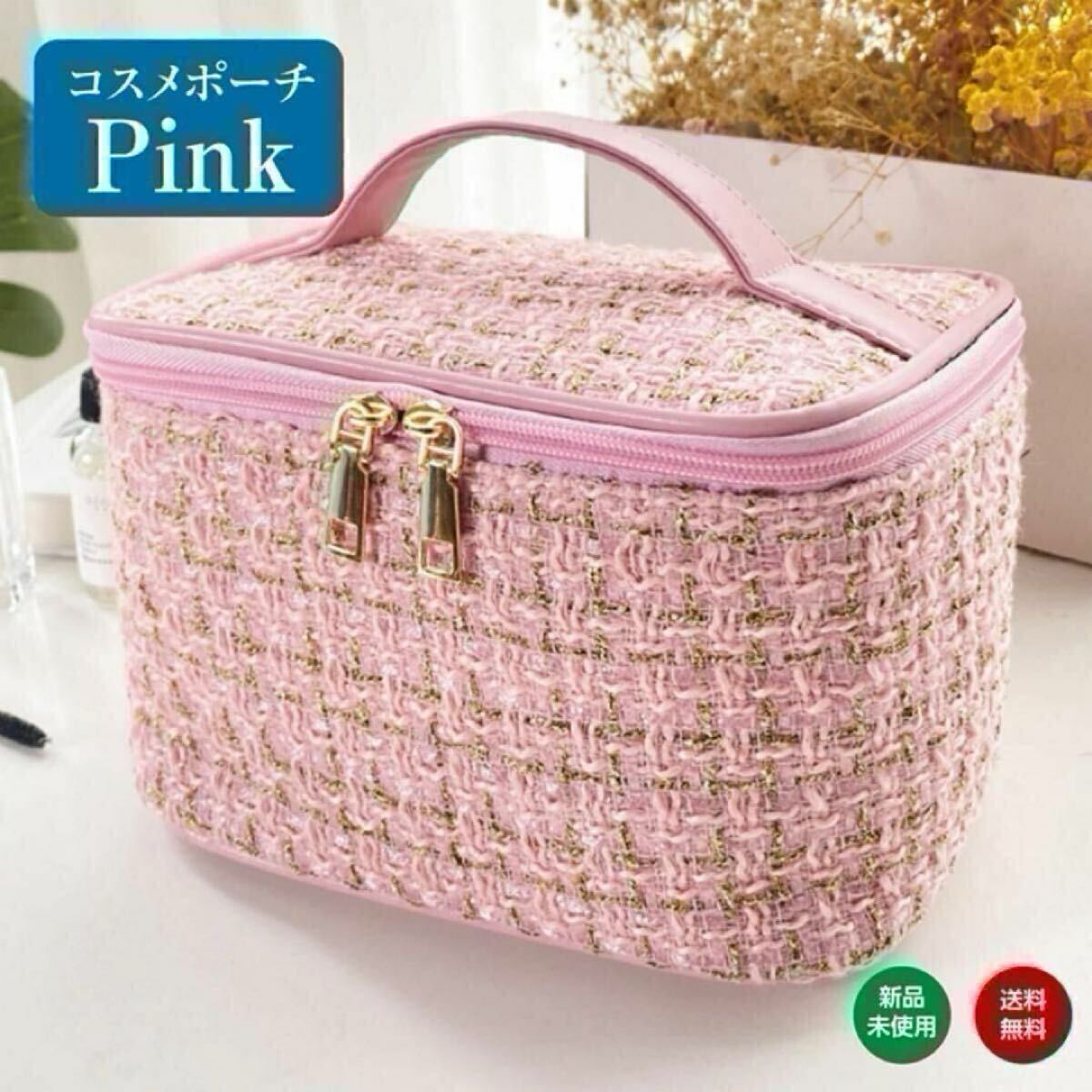 - ピンク バニティ ツイード コスメポーチ 化粧ポーチ 大容量 コスメボックス レディース メイクポーチ