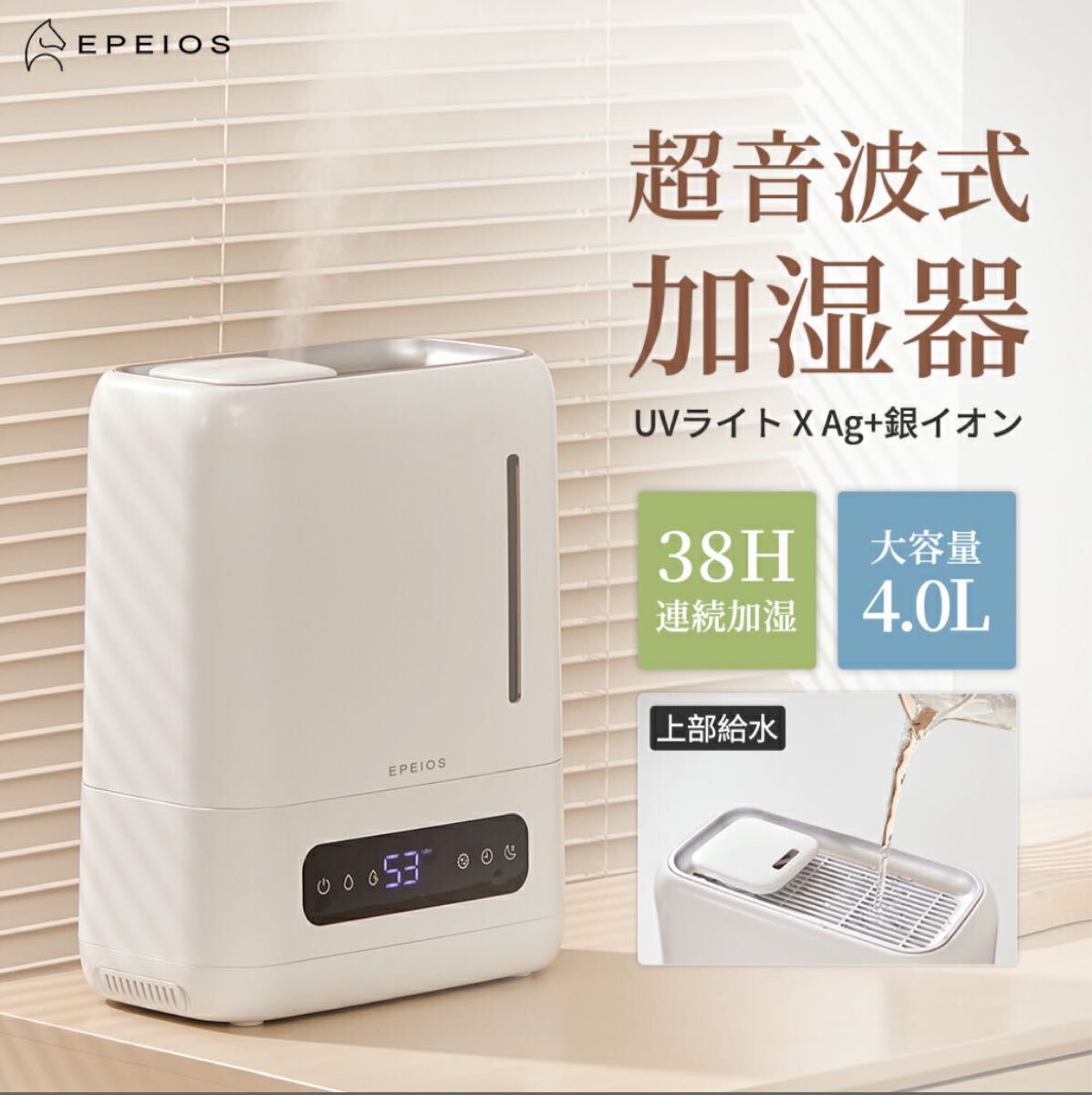 - 加湿器 ハイブリッド 4L 大容量 上部給水式 UV除菌 銀イオン抗菌 超音波