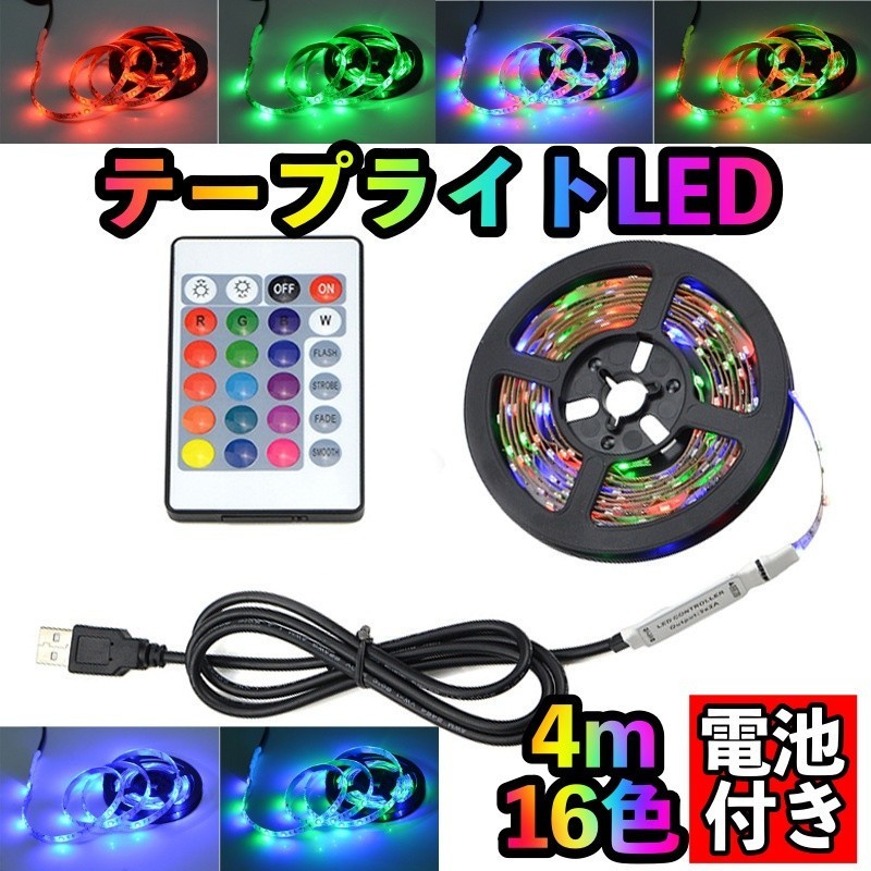 - LEDテープライト 4m 16色 リモコン・電池付き 間接照明 おしゃれ USB