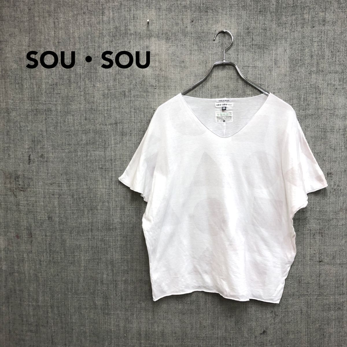 - 2K1556-G-N◆ SOU・SOU ソウソウ ジバン 京型ゆうぜん染め Tシャツ カットソー 半袖 Vネック パイピング 図形柄 ◆ sizeSS 白 綿