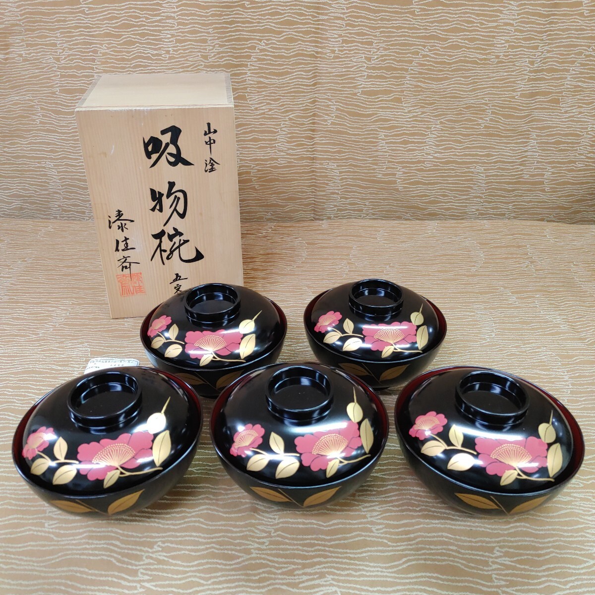 - 【山中塗 蓋付き吸物椀 5客】 山中漆器 和食器 漆 佳斉? 漆器 汁椀 お椀 共箱【B6-4②】0916