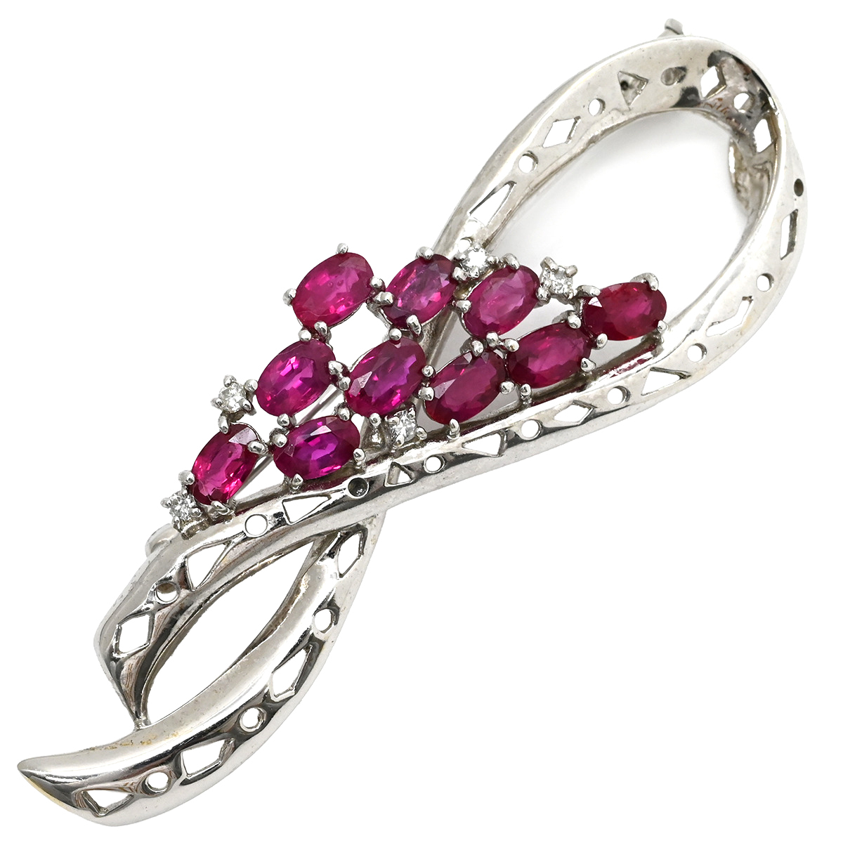 - ブローチ ルビー ダイヤ K18WG シルバー 赤 レッド 中古