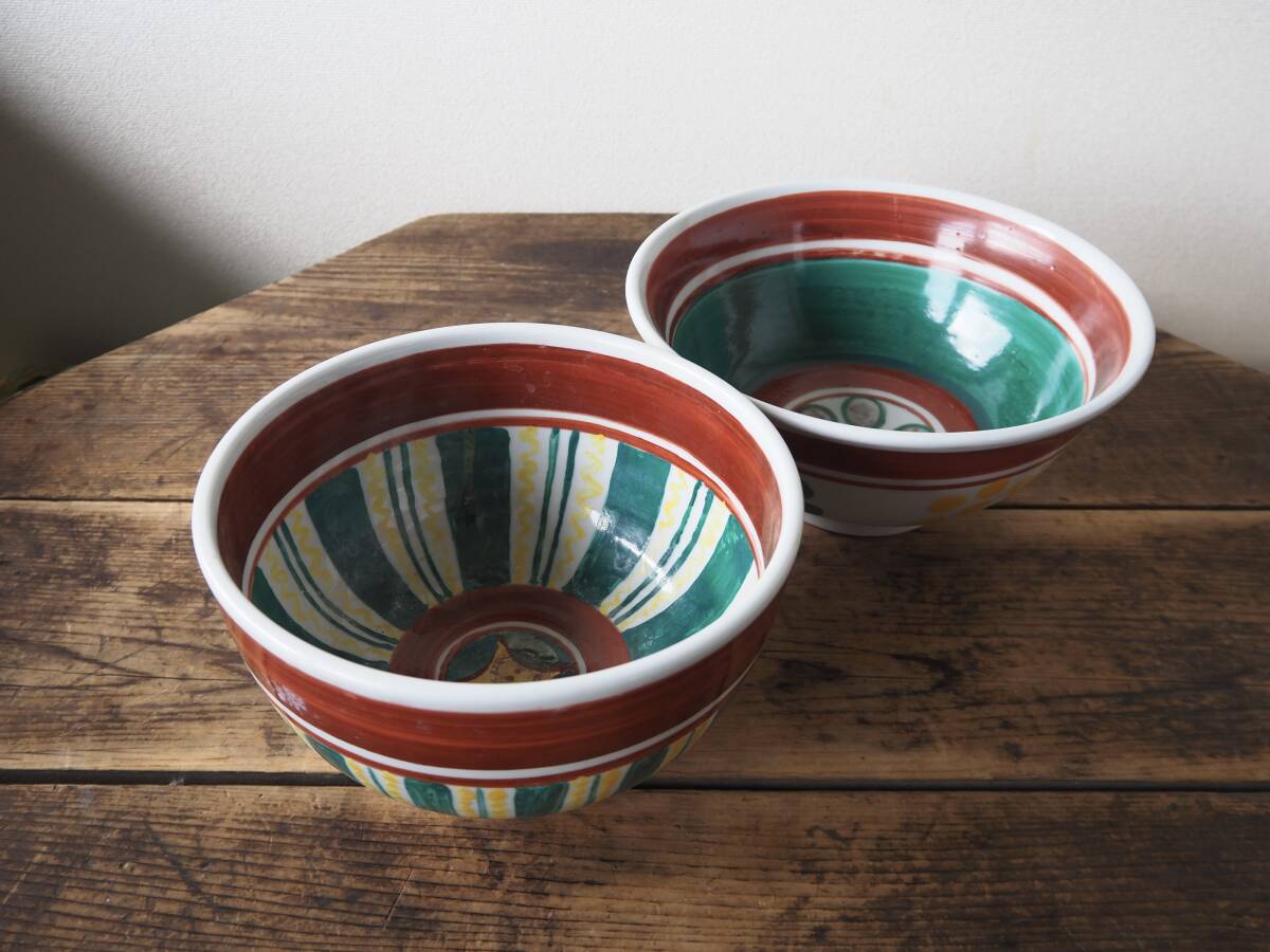 - 【OAN】時代物 銘有 色絵 大鉢どんぶり 縞模様 2客 骨董 古美術 古道具 民藝 古民藝 茶道具 懐石 古玩 赤絵 丼ぶり 茶碗 ボウル
