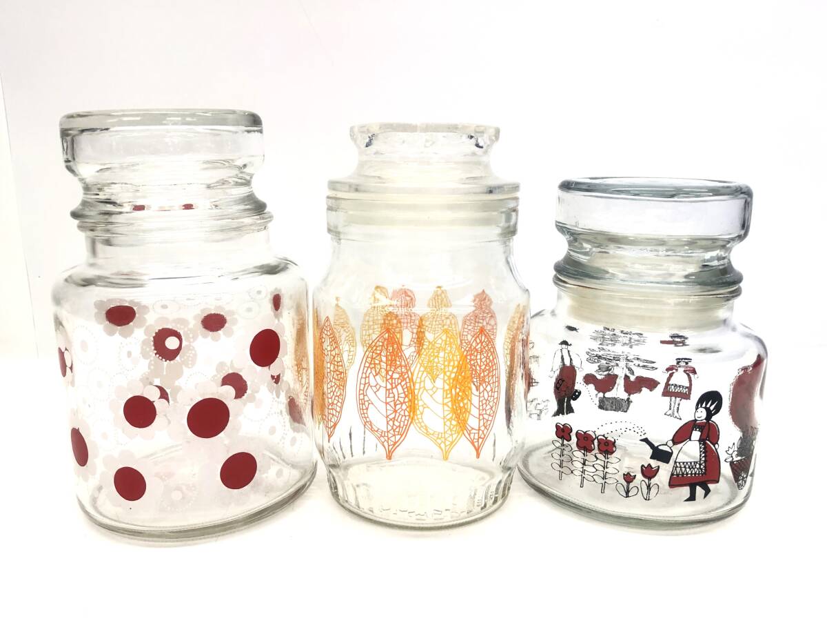 - アデリアガラス 昭和 レトロ 保存瓶 ガラス瓶 キャニスター キャンディーポット 3点 かわいい キッチン雑貨 食器 インテリア 飾り物 置物