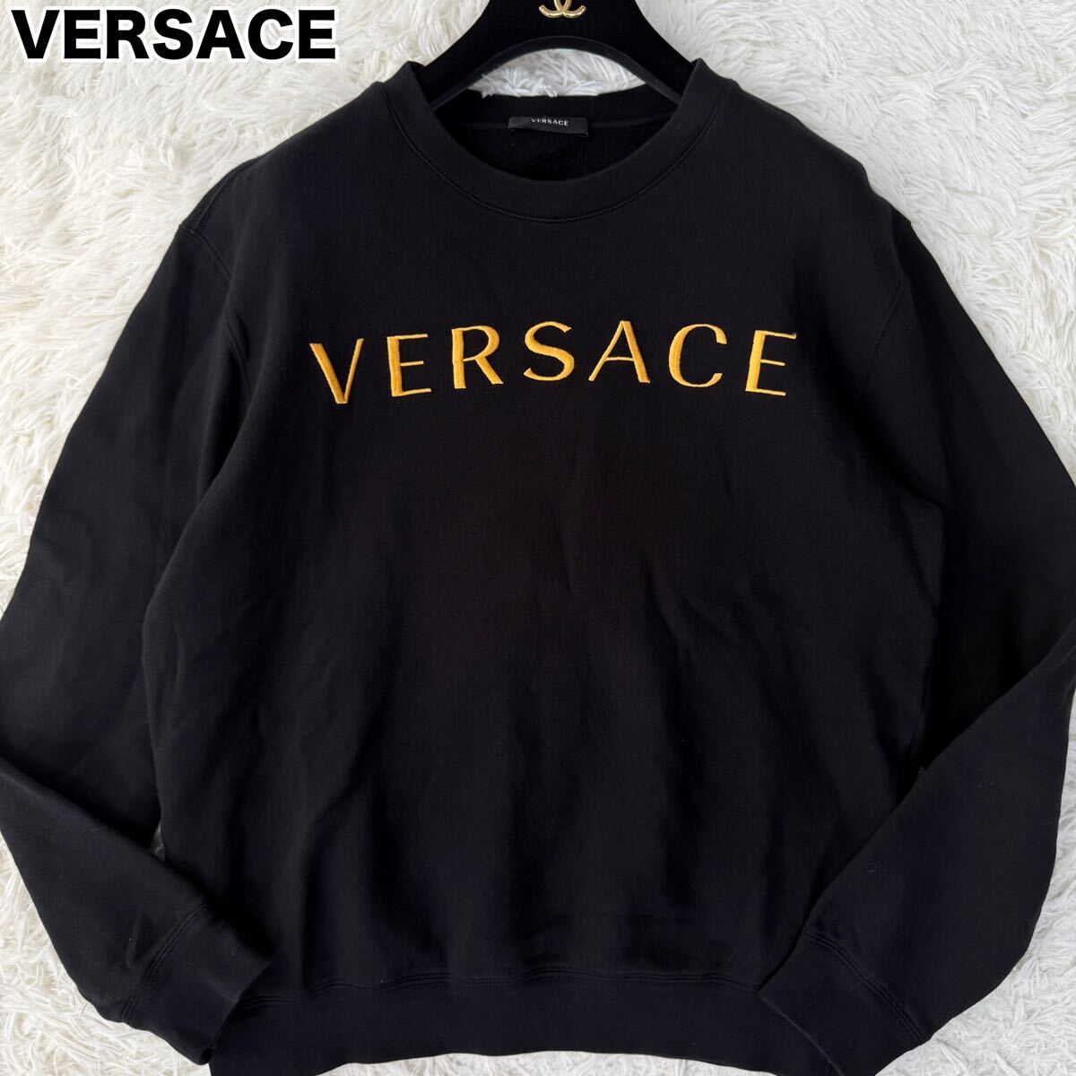 > 美品 希少L VERSACE ヴェルサーチ デカロゴ ゴールド刺繍ロゴ スウェット スウェットシャツ トレーナー ブラック メンズ ヴェルサーチェ
