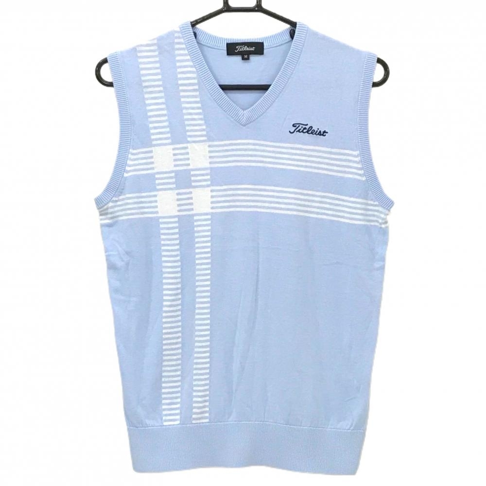 > 【美品】タイトリスト ニットベスト ライトブルー×白 ボーダー ロゴ刺しゅう メンズ M ゴルフウェア TITLEIST