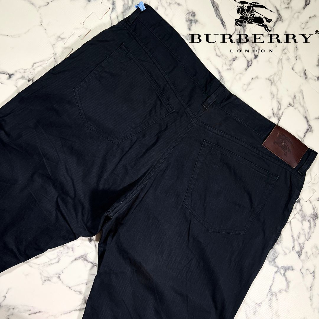 - 麻ストレッチ素材/特大W42(3XL位)●BURBERRY 薄手 ストライプ柄 スラックス パンツ ブラック 黒 レザーパッチ 刻印 バーバリー ロンドン 綿
