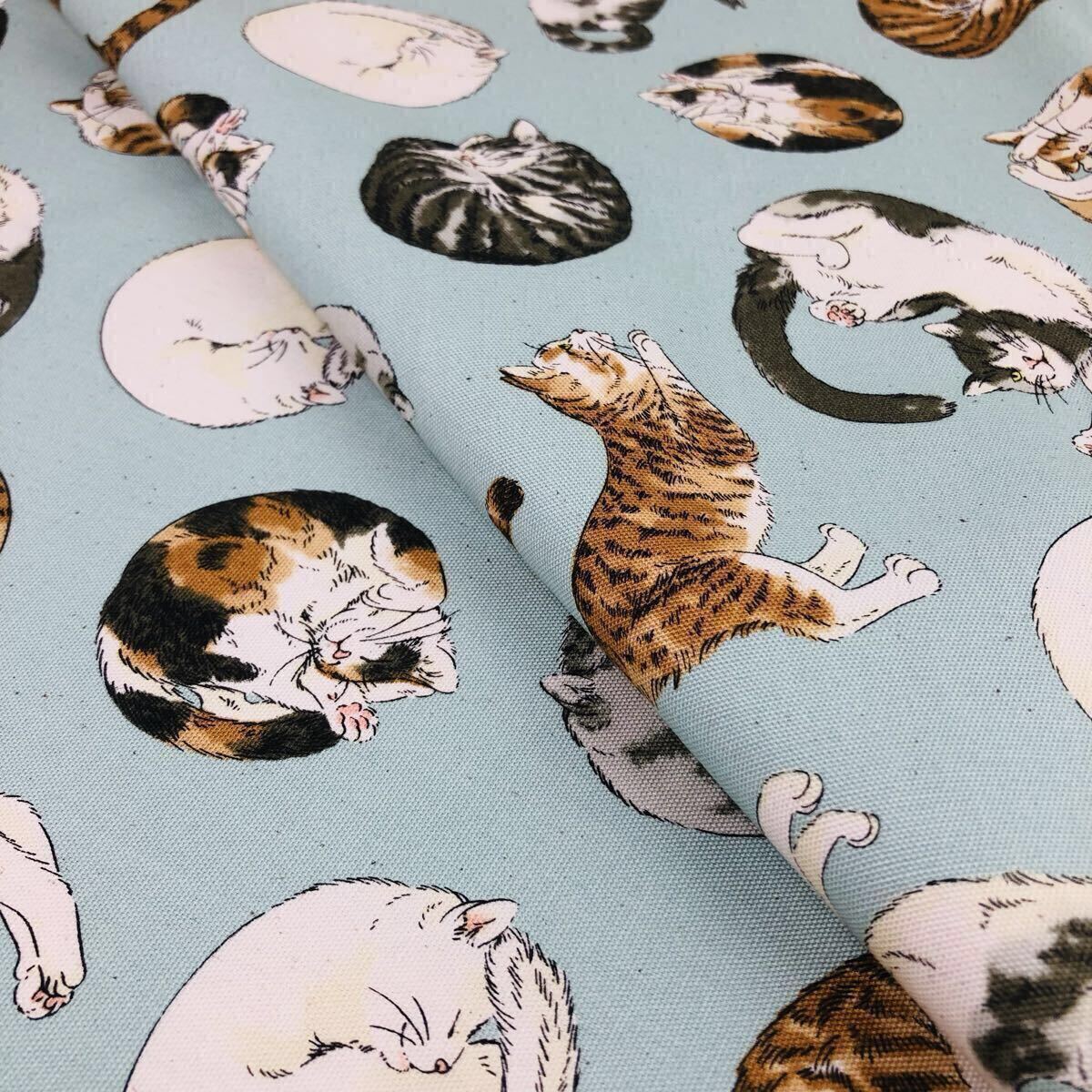 - 1m 日本製 生地 三毛猫 オックス生地 はぎれ 110×100 ミント ネコ柄