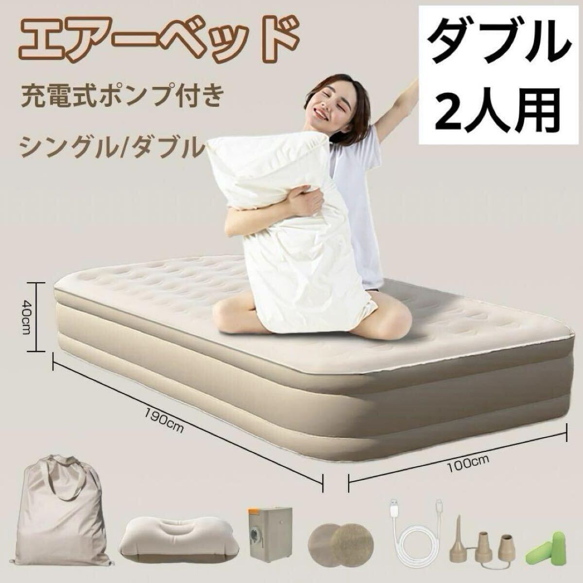 - 【40cm極厚】電動エアーベッド ダブル 4000mAhバッテリー内蔵 折り畳み式エアーマット 防水加工 耐荷重400kg 防災 アウトドア 車中泊