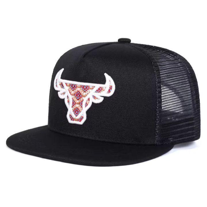 > 新品 エスニック ブル 刺繍 メッシュ キャップ 野球帽 帽子 ブラック メンズ レディース ユニセックス アメカジ ストリート