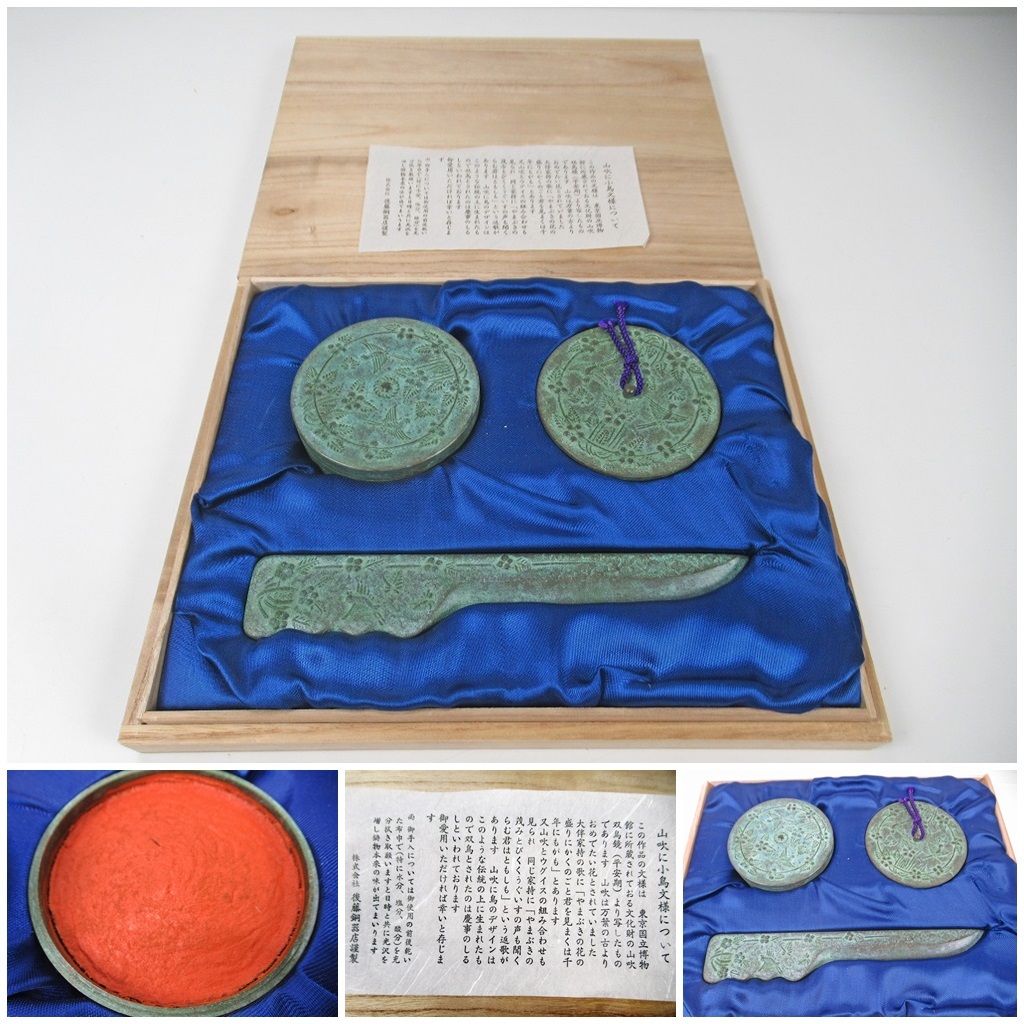 - ☆[A69]銅製 山吹双鳥鏡 朱肉入と文鎮 ペーパーウェイト 文鎮 箱入り アンティーク