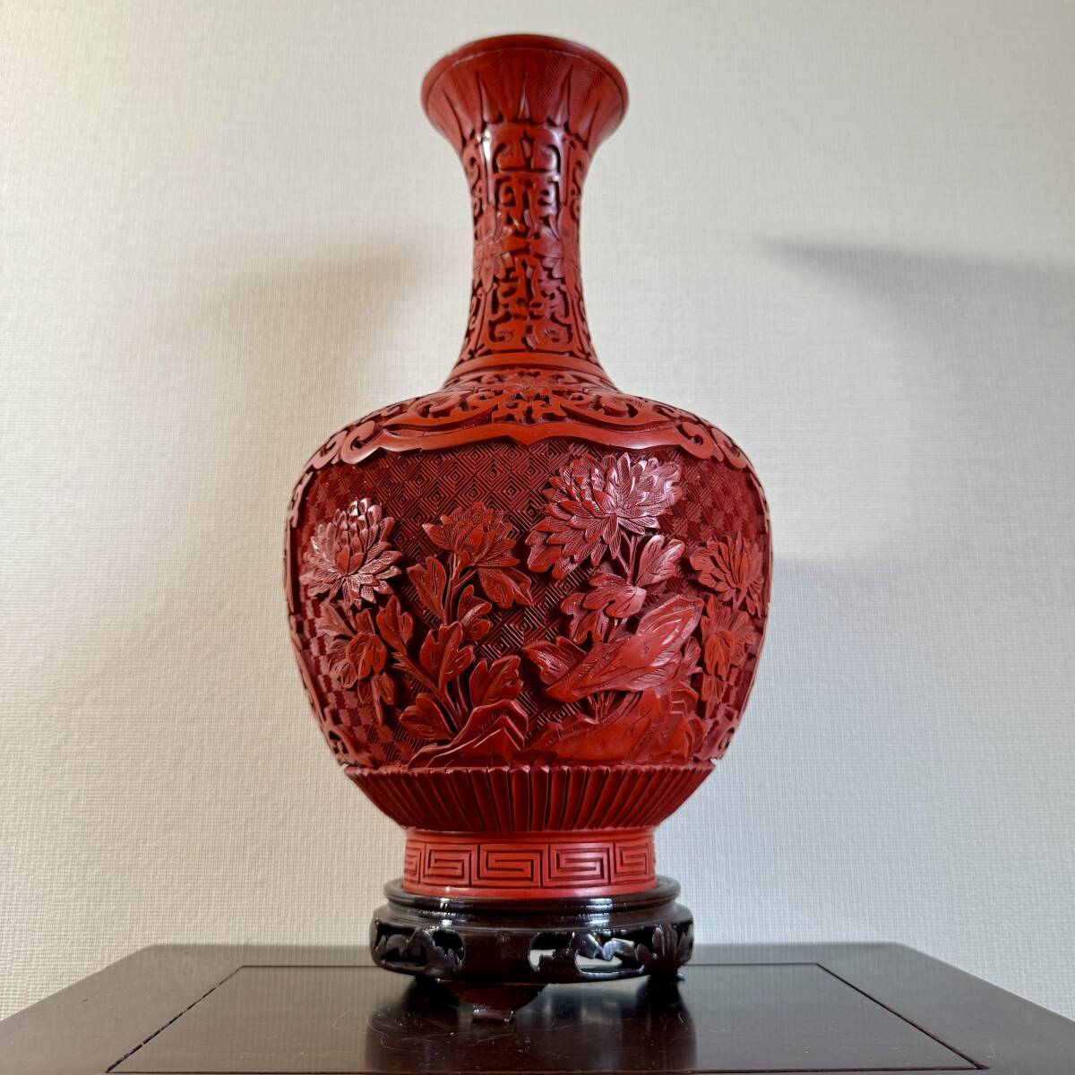 - 中国美術 堆朱 花瓶 台付 高さ34cm/ 唐物 漆器 煎茶道具 茶道具 茶器 古美術 骨董 東洋彫刻 彫漆 漆工芸 古玩 仏像 朱塗 置物 花入 花生