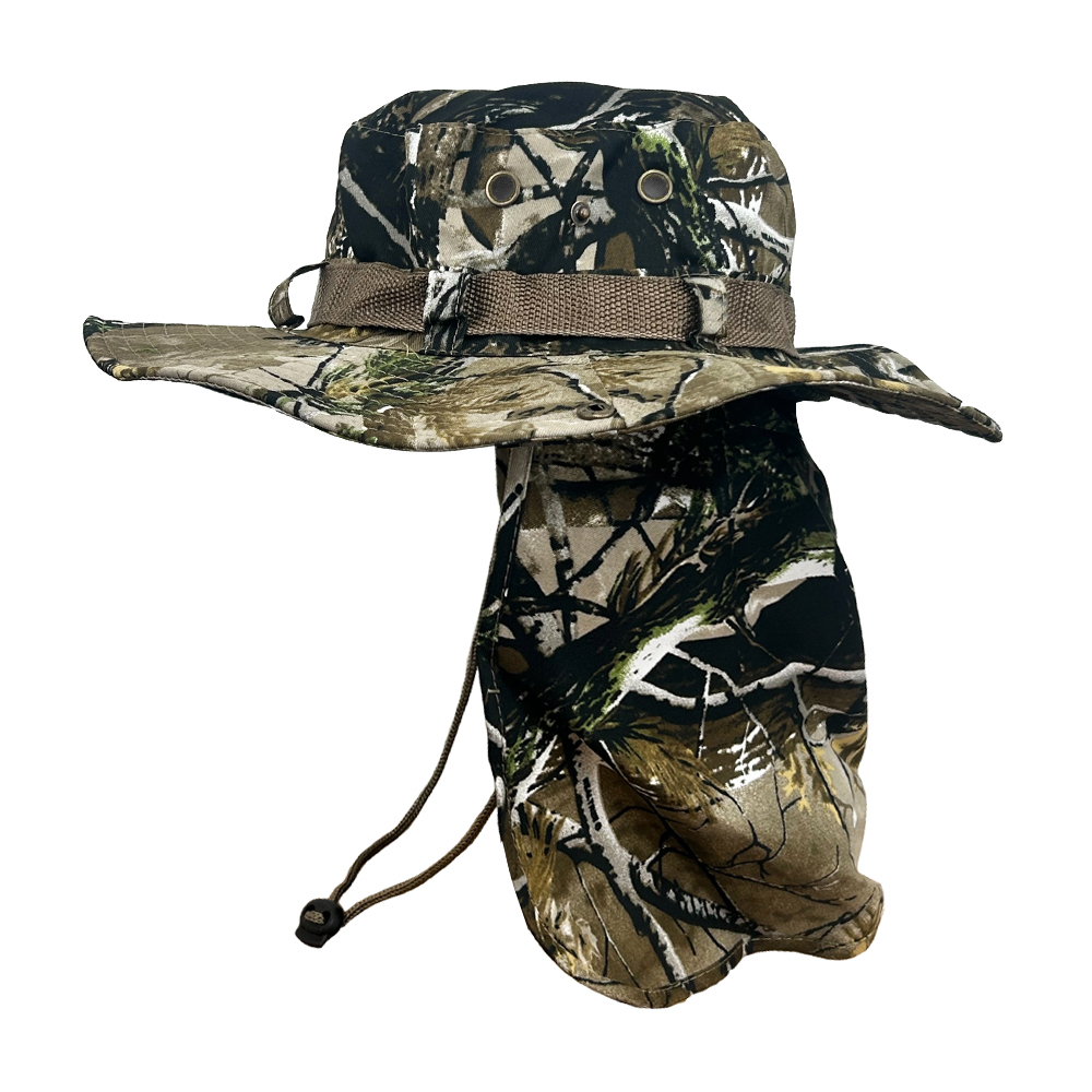 リアルな木の幹や葉、枝がデザインされた迷彩柄が特徴のブーニーハット。