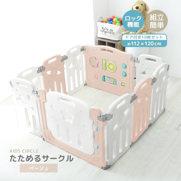 - 新品 ベビーフェンス 10枚セット おもちゃ付き ドアロック 簡単組立 ベビー ガード キッズ サークル ミュージカルキッズランド ベージュ