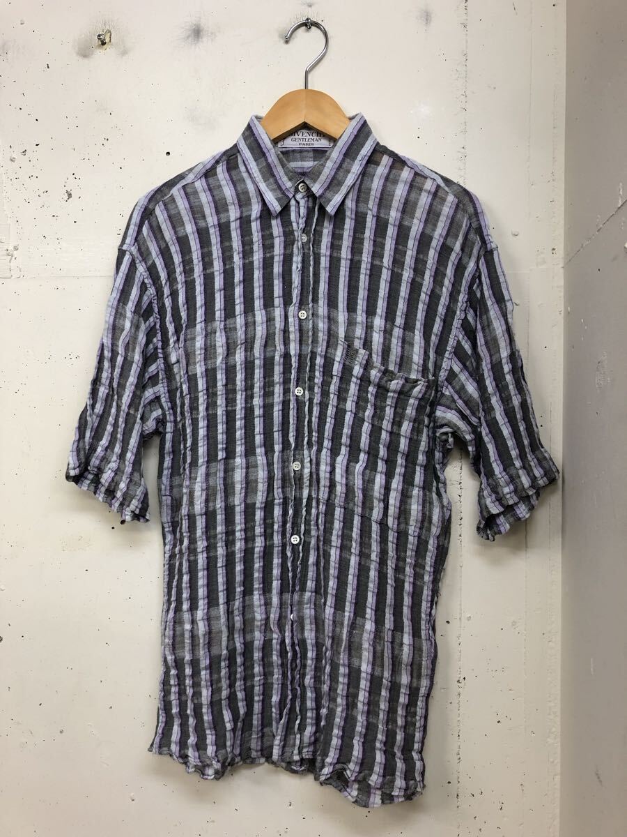 > vintage GIVENCHY GENTLEMAN PARIS コットン&リネン 半袖シャツ ストライプ S グレー 紫 イタリア製 ジバンシィ