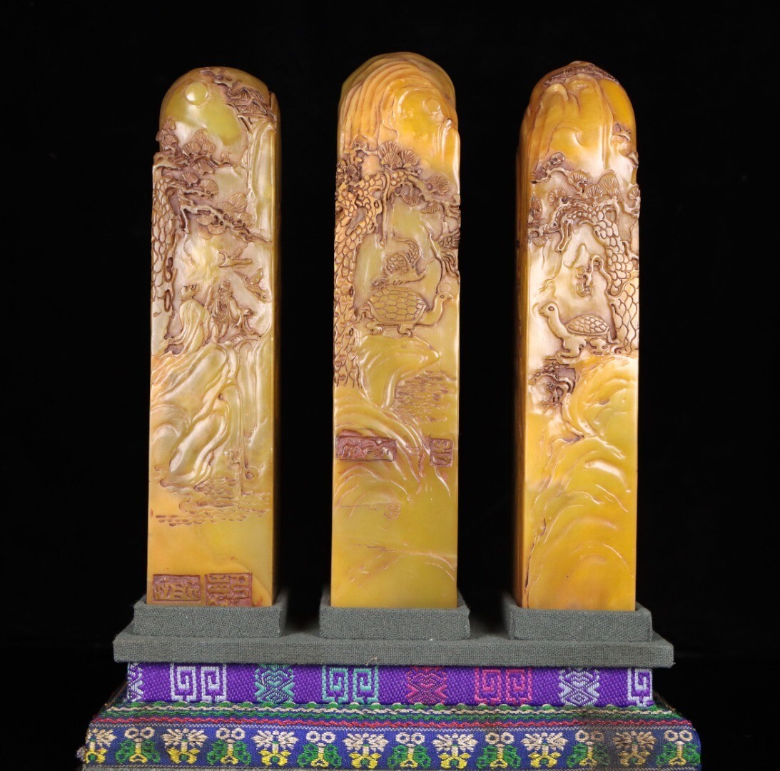 - 【永】清時代 黄易銘 壽山石 田黄石彫 山水人物紋 印章 印鑑 印璽 手彫 極細工 置物擺件 古美術品 時代物 古董品 旧家蔵出 中国唐物 1523g