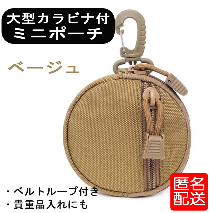 - ポーチ メンズ カラビナ アウトドア 小物入れ ベージュ 丸形 ベルトループ コインケース 貴重品 キャンプ サバイバル キーケース