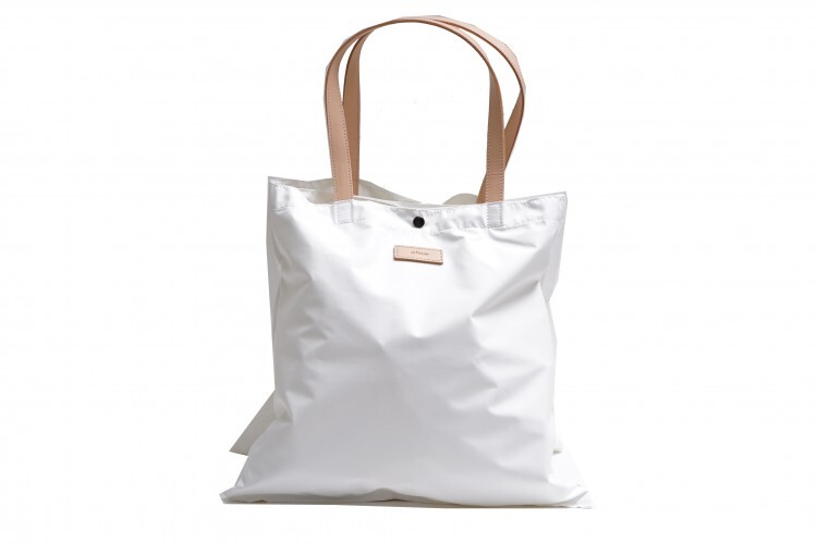 透湿防水素材「ブリザテック」とヌメ革を組み合わせたトートバッグメインの収納は前後2層に分け、真ん中に小口の収納スペースをもたせた使い勝手のいい仕様になっています。収納に応じてシルエットが変わるギミック感のあるバッグです。
