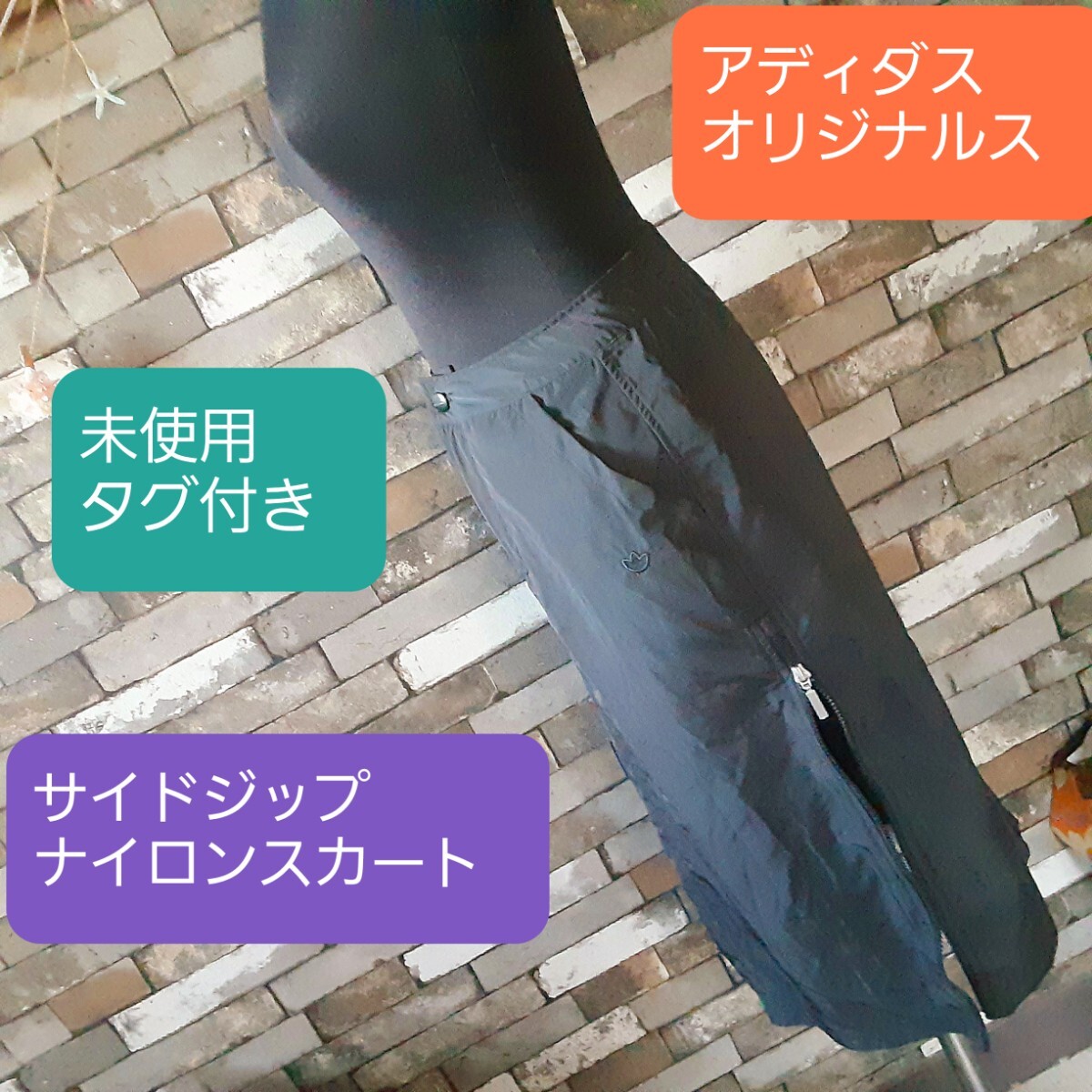 - 黒 無地 ナイロンスカート サイドジップ アディダスオリジナルス ロゴ入り