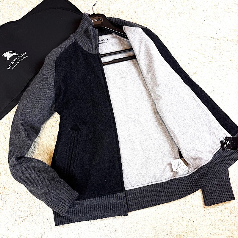 > 未使用級部分革BURBERRY BLACK LABELジップトラックジャケットL~Mメルトンラムウール黒灰色2バイカラー ブラレ バーバリーブラックレーベル