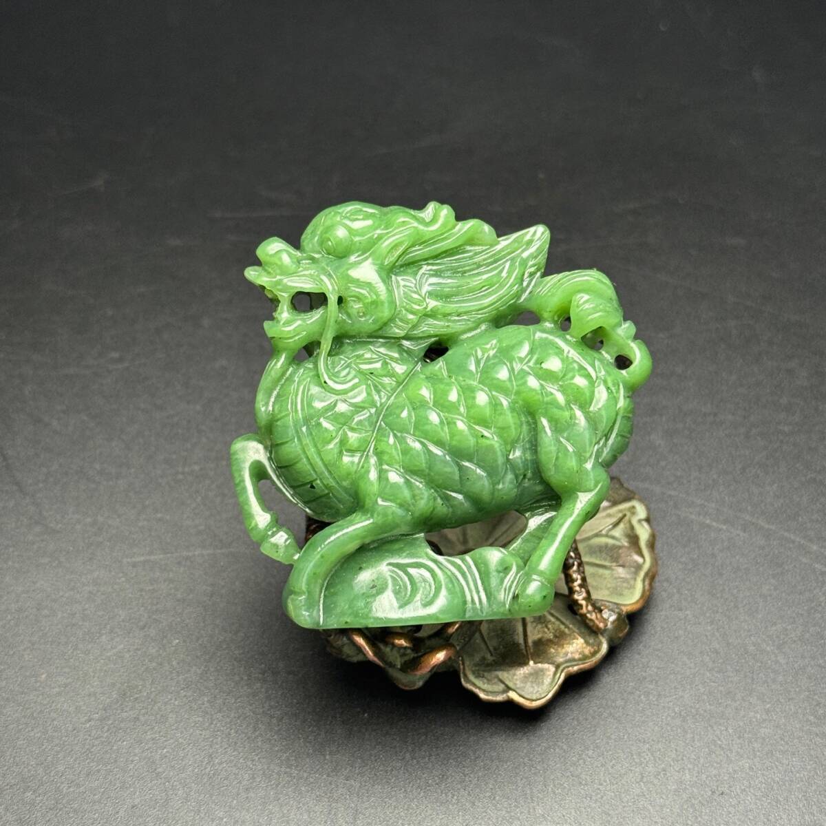- 蔵友旧蔵出 和田玉製 細密彫 碧玉 麒麟獻寶 盒付 玉質細膩 希少珍品 貴重品 置物 古賞物 中国古玩 中国古美術品